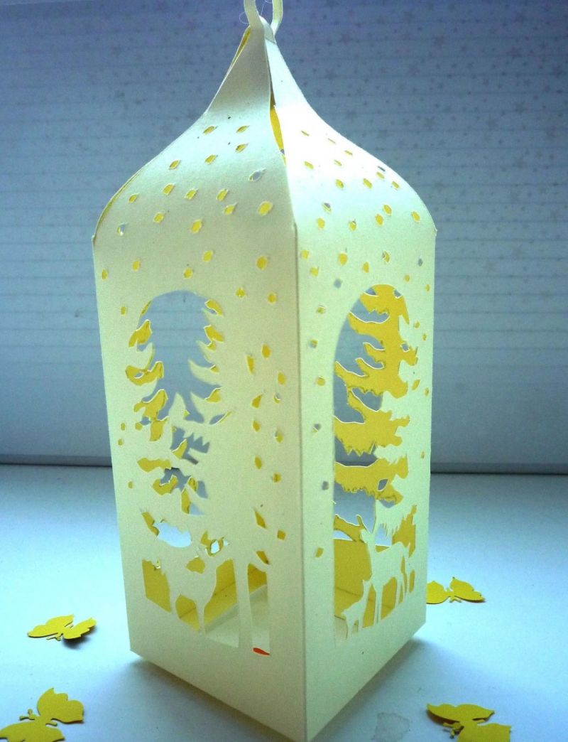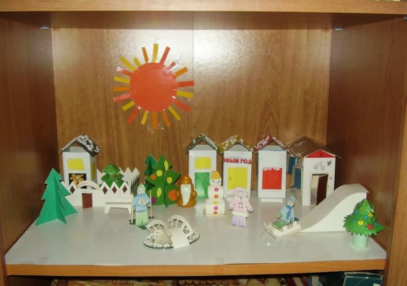 Основата на конструкцията - няколко кутии, които се закрепват към стената, поради ниското тегло, което е лесно да се направи. Покрита е с цветна хартия и е окачена с гирлянди. Фигурките на северни елени, зайци или миниатюрни коледни елхи ще изглеждат добре отгоре.