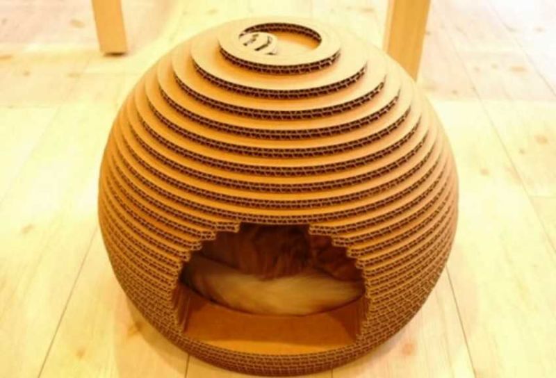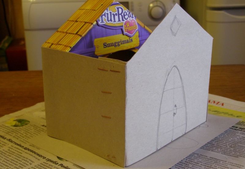Картонена къщичка с прозорци и врати ще е удобна за котките. За да направите конструкцията стабилна, можете да подсилите стените с тънък шперплат и да използвате картона като носещ материал.