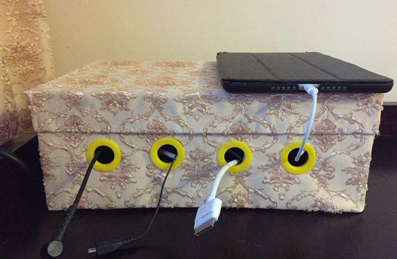 Картонът е и добър начин за организиране на притурките и кабелите. Направете отвори в стената на кутията и поставете крайните пръстени. През тях се прокарват проводници, а вътре се поставя тройник или пилот с гнезда.
