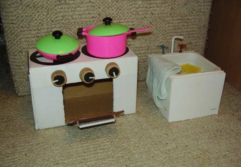 Съвет: обикновеният кафяв картон не е интересен за децата, затова украсете кухнята с ярки цветни стикери или платове. Попитайте детето си за цветовите му предпочитания - нека помисли за стила на кухнята и куклите си.