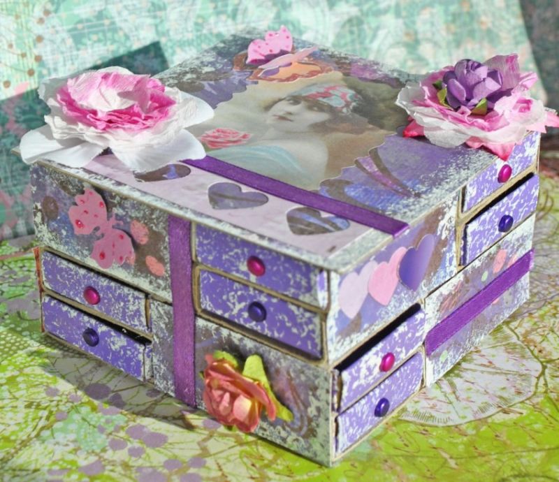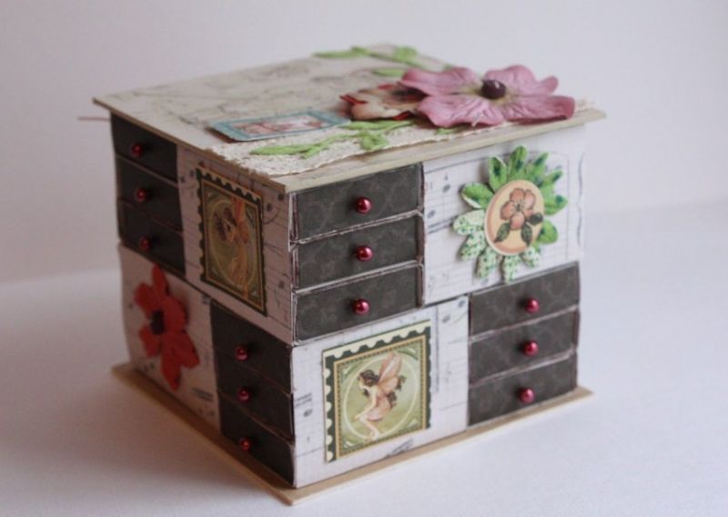 Много е удобно да се правят различни кутии с чекмеджета. Трябва да проектирате рамка и да използвате различни материали за довършителни работи - плат, дантела, копчета, раковини.