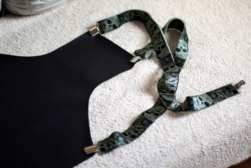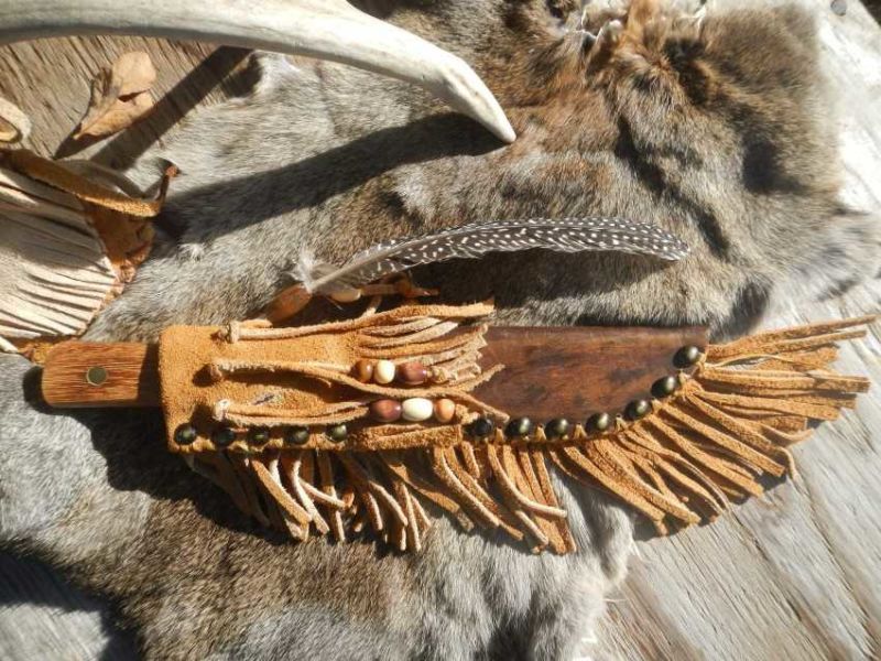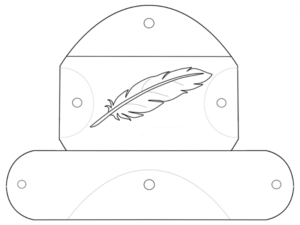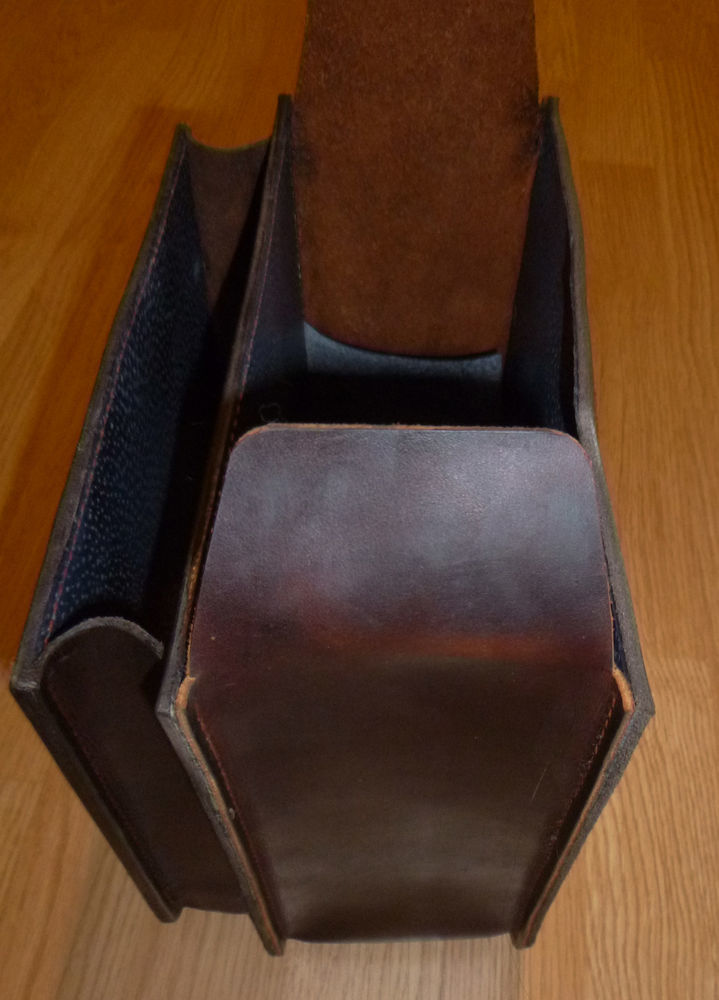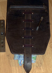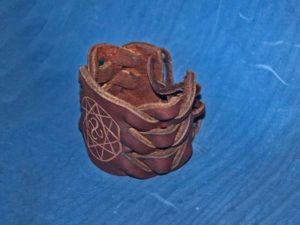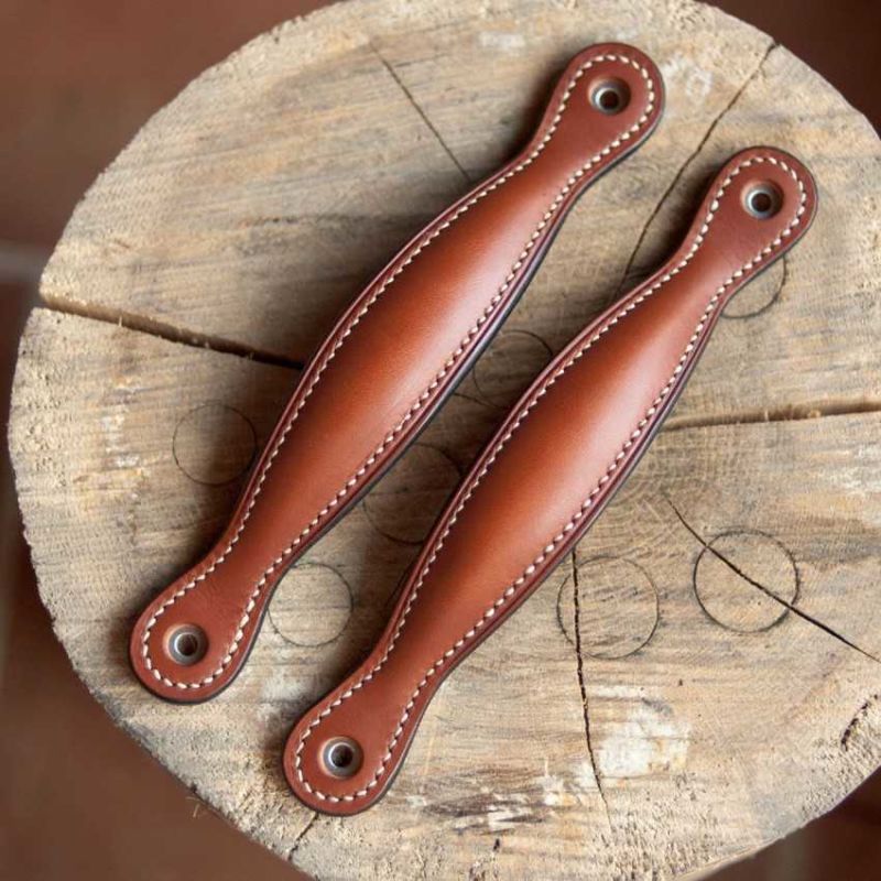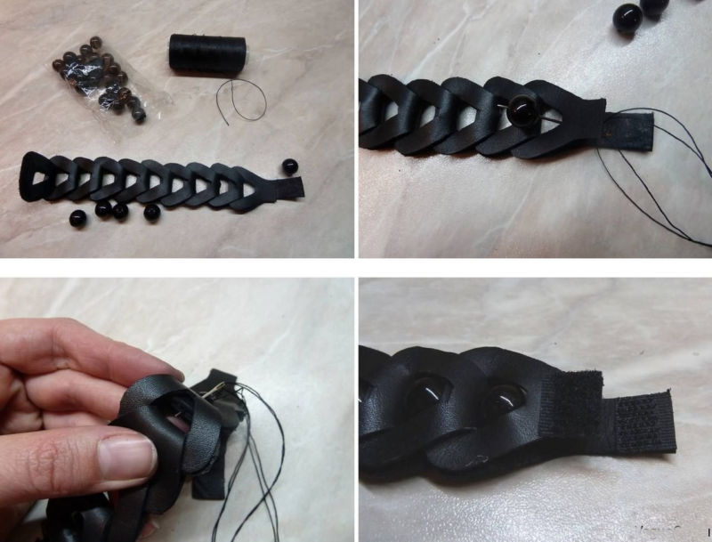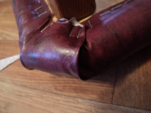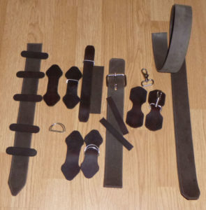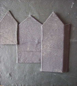 - От кожата, обработена чрез растително дъбене и с дебелина не по-малка от 1,8 mm, изработваме 4 ленти с ширина 15 mm и дължина около 150 mm. Скосете ивиците само от външната страна, боядисайте ги и ги огънете.
