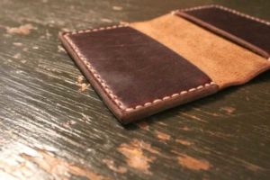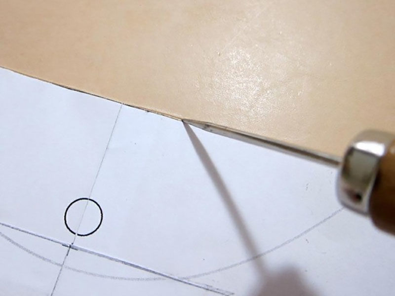 - Зашийте задни съединения в кожата. Използвайте компас, за да маркирате вътрешността. За правилно позициониране се отдалечете от ръба на разстояние, равно на дебелината на кожата. След всички манипулации отрежете скосяването, строго под ъгъл от 45 градуса.