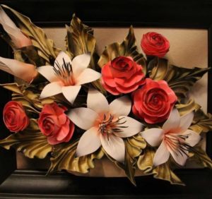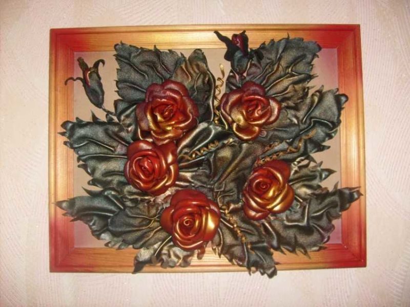 - Оформете основния материал. Прикрепете готовите рози към картината с лепило. Редът на поставяне зависи изцяло от вашите желания и въображение. Ако желаете, добавете допълнителни декорации към панела. Работата е завършена!
