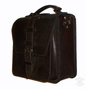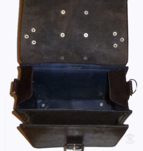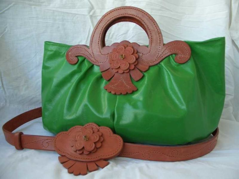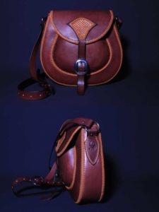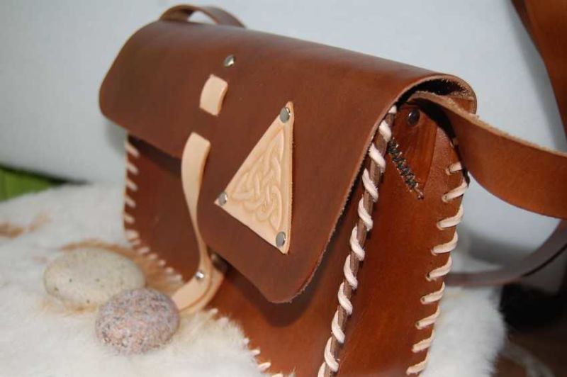 - За дръжките пригответе 2 правоъгълни парчета: 3 см на 80 см и 3 см на 30 см. Залепете обратната страна на кожата, сгънете краищата към центъра и зашийте, като при необходимост почуквате с чукче. Ако кожата е дебела, дръжката просто се изрязва от нея. Можете също така да използвате верига, хубав шнур.