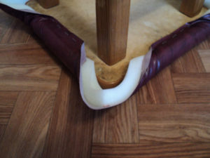 - Поставете табуретката си с главата надолу. Завържете възел в края на въжето, за да получите дълга опашка. Когато шиете, шнурът трябва да е опънат, а платът да е притиснат към седалката. Ако спазвате всички правила, ще имате красив ръб.