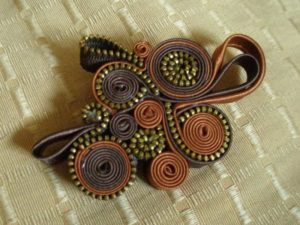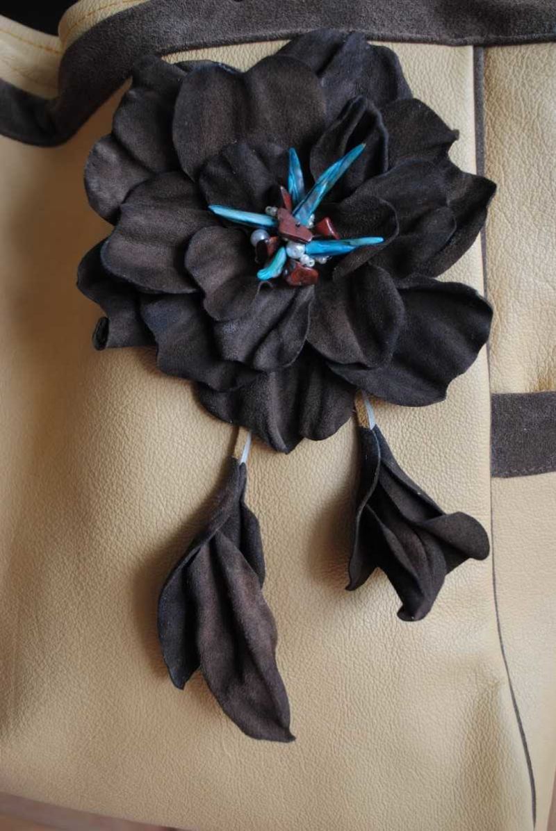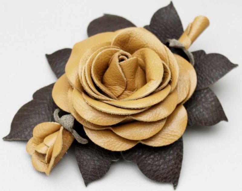 - Направете кръгла кожена основа с радиус около 2 см. Залепете големите листенца по ръба на кръга, след това средните и малките към средата.