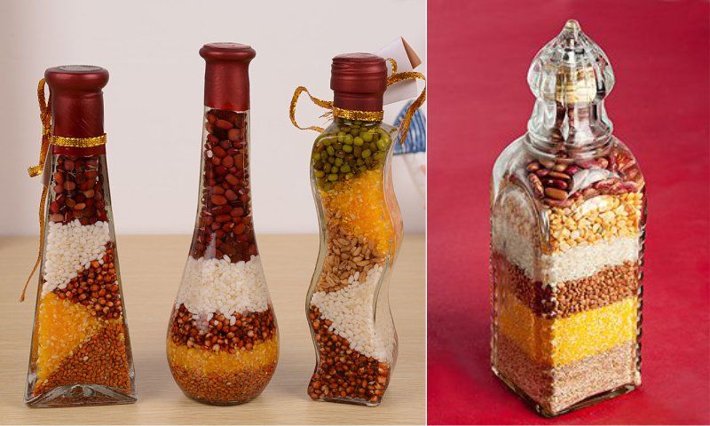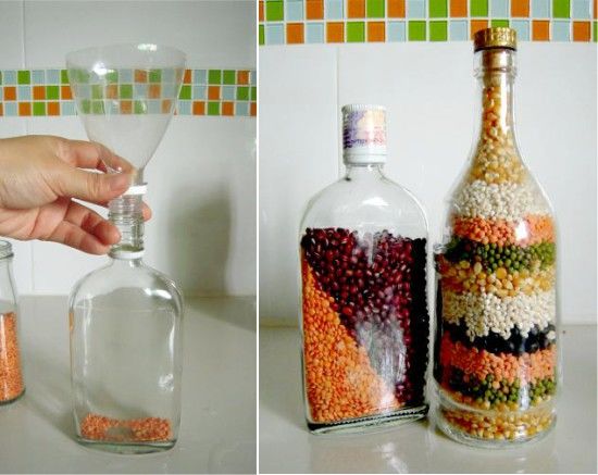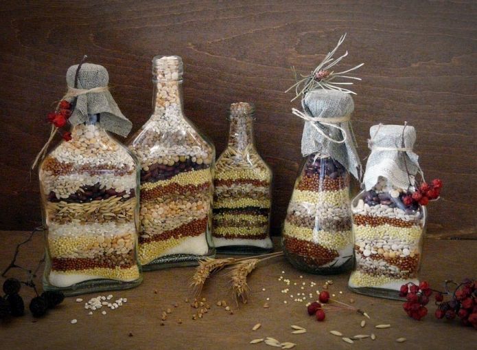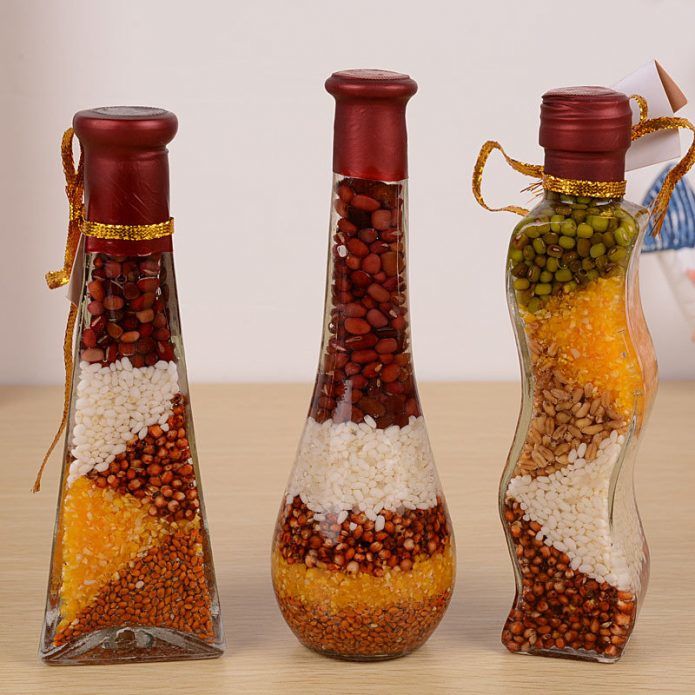 Частта, която ще се декорира, се грундира, към нея се прикрепят зърна и песъчинки под формата на шарки, които можете да редувате на ленти. Крайният резултат е красива бутилка за украса.