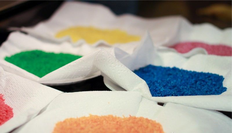 Необходими са тежки полиетиленови торби. Те са пълни с грис. Добавя се алкохол от 2 супени лъжици или 4 лъжици оцет. Следващата стъпка е да изсипете оцветителя в торбичката. След това трябва да се затвори и да се разклати, така че всичко да се оцвети в желания цвят.