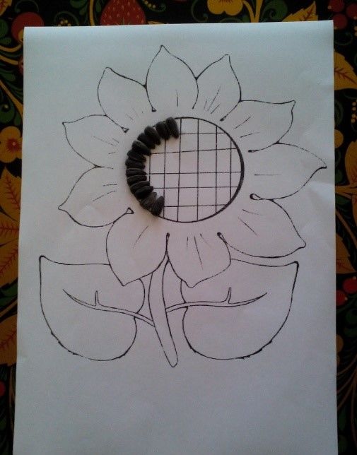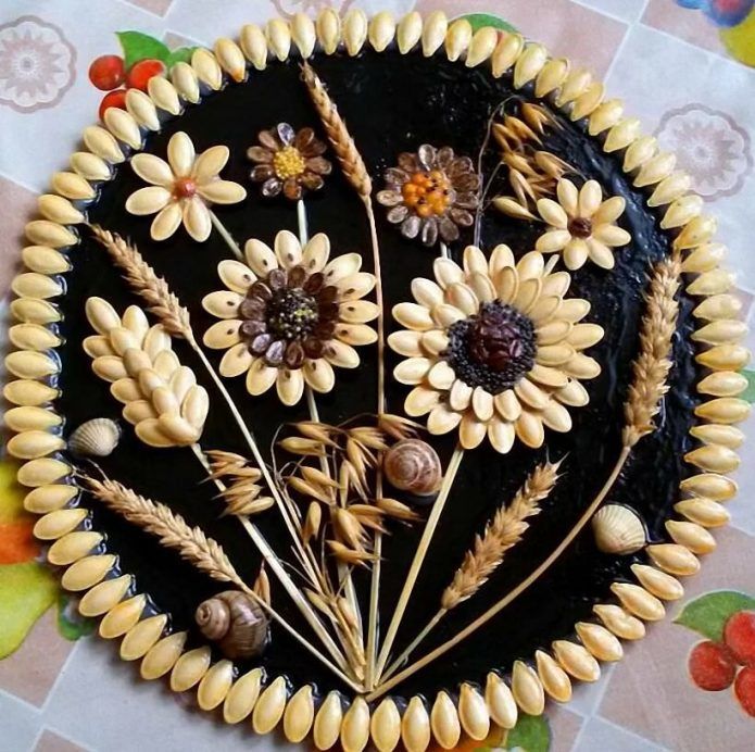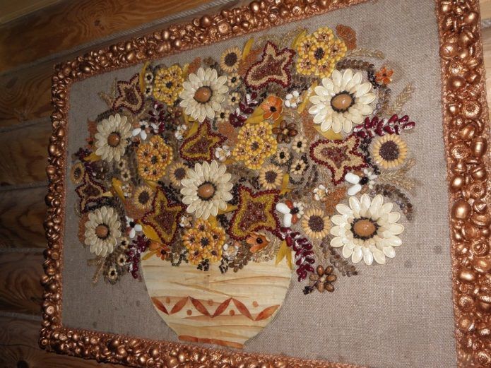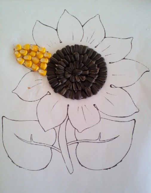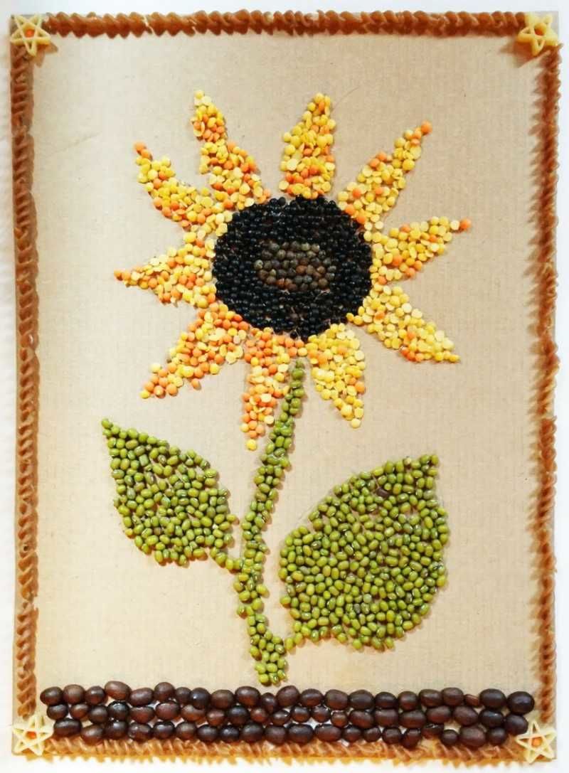 Като начало трябва да вземете картон, за да направите цвета, а ако не, тогава боя. Важно е да се направи скица на всички компоненти на картината. След това се намазва с лепило и се пълни с различни видове зърнени храни, боб и семена.