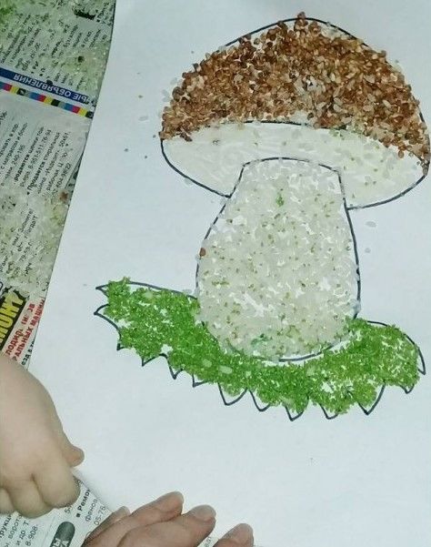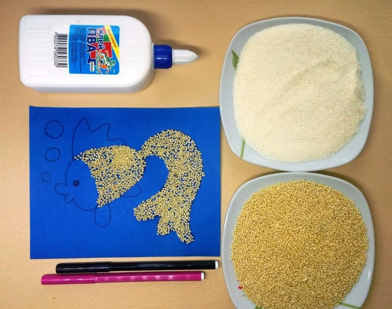 След това намажете картината с лепило PVA. Можете да започнете с елда, просо и ориз. Тези материали са по-лесни за работа за децата.
