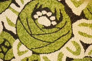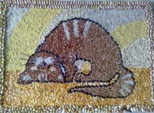 Черните участъци се залепват с лепило, а зоната около котенцата се облицова с бели зърна. Крайният резултат е картина, която може да се използва за украса на стая или за подарък.