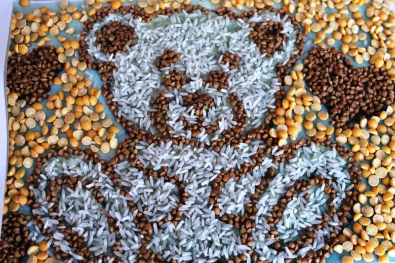 Най-интересната дейност по зърнени изкуства за деца е създаването на картина. Когато се прави за първи път, е необходимо да се наблюдава от възрастен. Преди да започнете, трябва да приготвите зърнени храни с различни цветове, картон, лепило и боя.