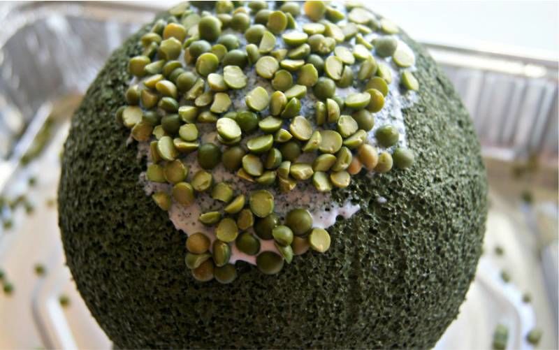 - Когато изсъхне, балонът се проверява и празните места се запълват с грах. С помощта на лепило стеблото се прикрепя към отвора.