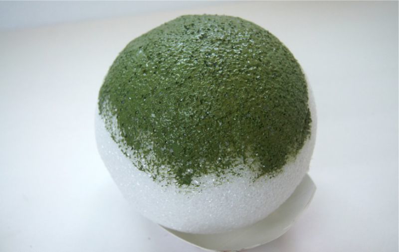 - Топката от стиропор се боядисва в зелено с четка за рисуване. Дайте време на всичко да изсъхне. В долната част на топката се прави малка дупка с шишче, за да се постави стеблото.