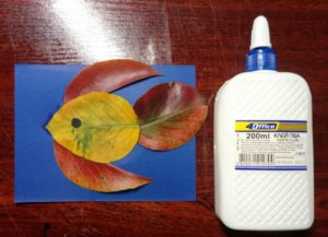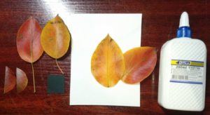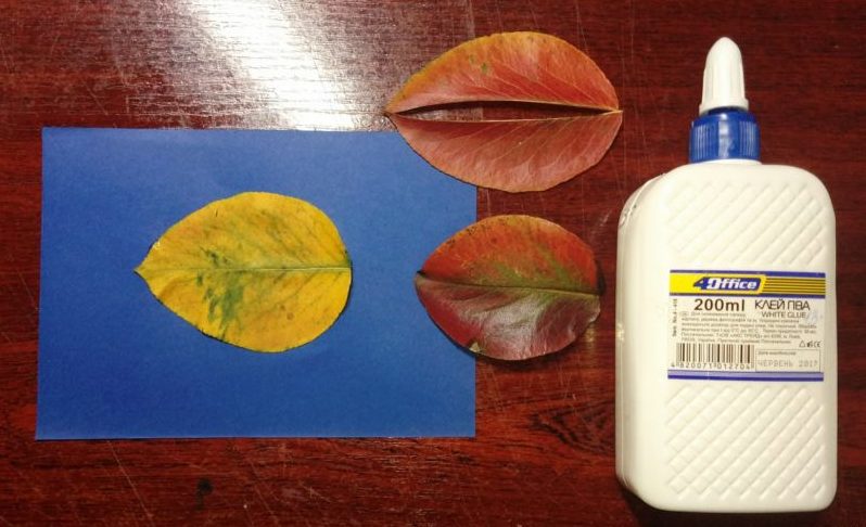 Необходими са ви цветни листа, картон с формат А5 и лепило. Залепете продълговато листо в центъра на ярко оцветен картон, например жълт, за да наподобява торс на пеперуда.