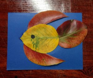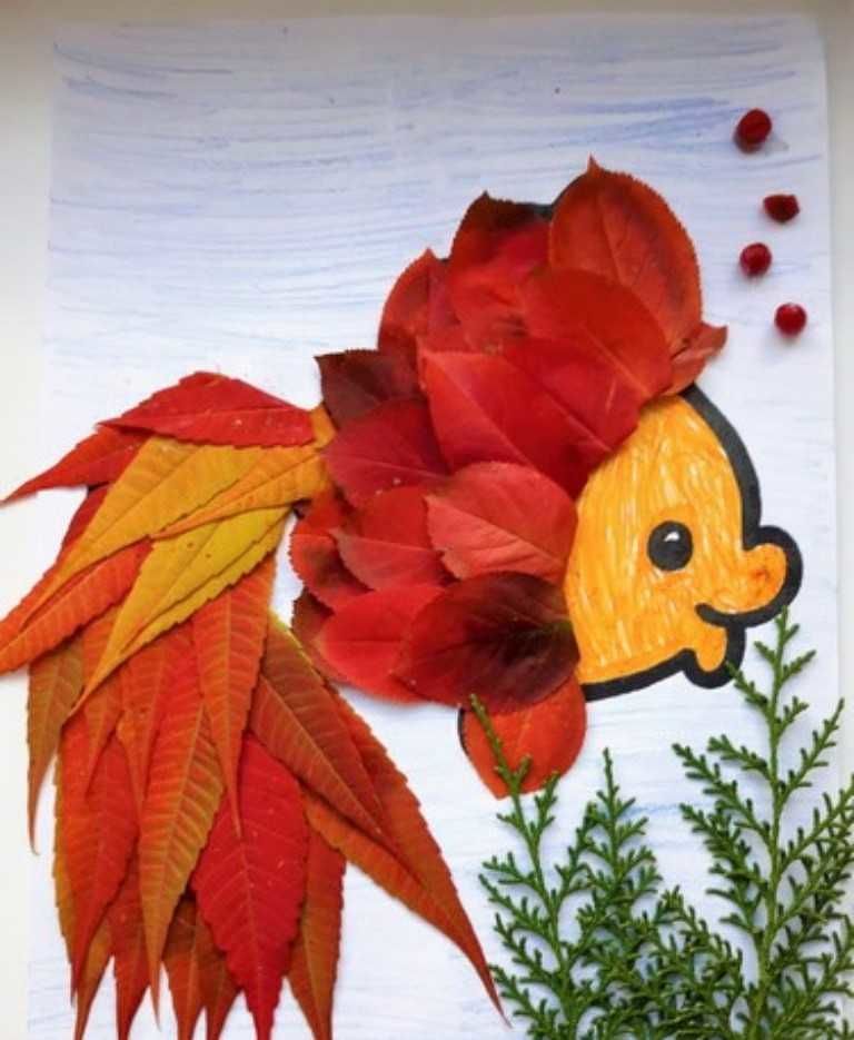 Приложението за риба е чудесна композиция от листа за 1. клас. Изсушените стръкове растения, подобни на водорасли, са залепени по краищата към основата от син картон. Рибите са направени от листа с различни размери. Например от брястово листо се изработва красива риба, за перки се използват листа от явор, а за опашка - листа от върба.