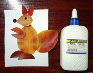 По-големите деца могат да направят колаж на катерица изцяло от листа. Необходими са ви листа от различни видове дървета.