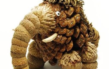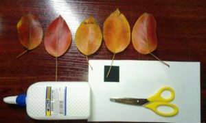 Пухкавата опашка е голямо дъбово листо. За ушите и лапите използвайте отделни листа от явор с различна големина. Използвайте боб или леща за очите.