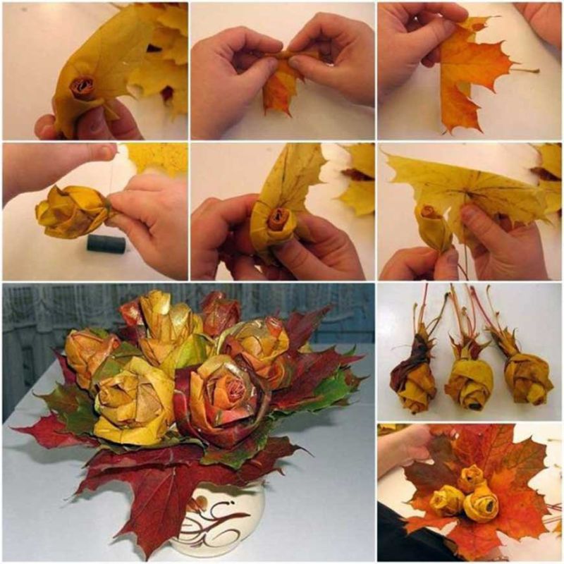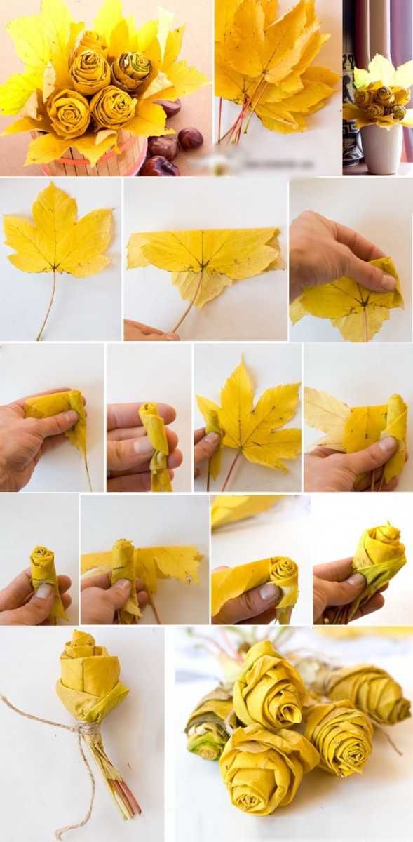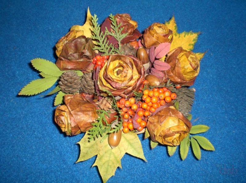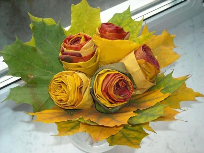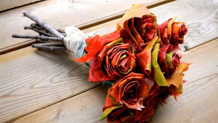 Необичайните букети от рози, направени от листа, изглеждат ефектно. Не е трудно да се направят. За ръкоделието пригответе: свежи кленови листа, клонки за стъблата, зелено тиксо, лак за фиксиране, конци или телбод.