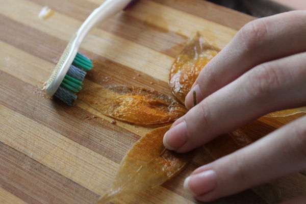 След като забършете с кърпа, използвайте четка за зъби, за да отстраните целулозата. Изплакнете с вода и оставете да изсъхне.