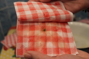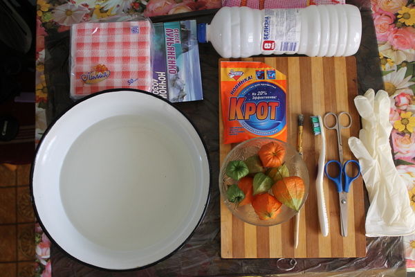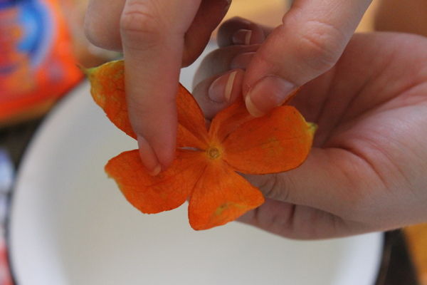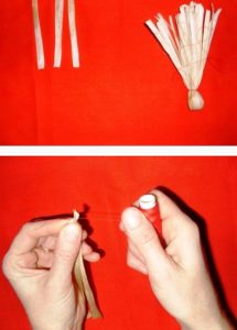 Предварително от тях се изрязват около 20 листенца с дължина от 3 до 6 см, с една заострена страна и кръгла основа за цветето с диаметър около 10 см и ширина на ивицата 4-5 см.