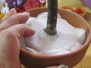 Изсипете гипсов разтвор в саксията и поставете ствола на бъдещото дърво. Поставете го във вертикално положение и го оставете да изсъхне напълно. Когато мазилката изсъхне, боядисайте цялата конструкция в цвят, който съответства на предвидения дизайн на дървото.