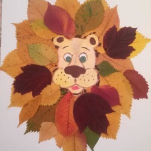 Създайте силует на лъвска глава по шаблон. Залепете жълти и оранжеви листа, които да съответстват на цвета на гривата. Залепете отгоре жълта глава от цветна хартия или боя.