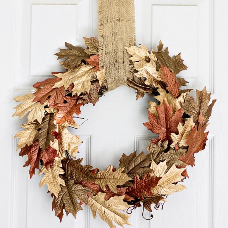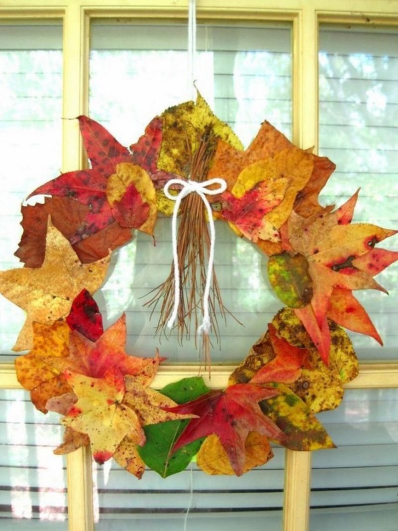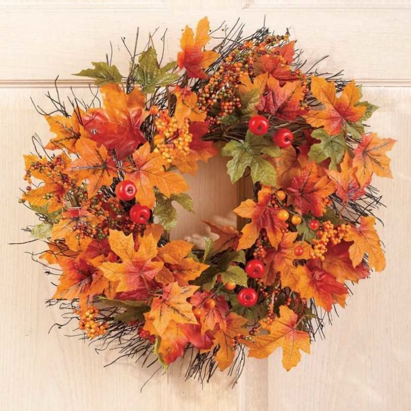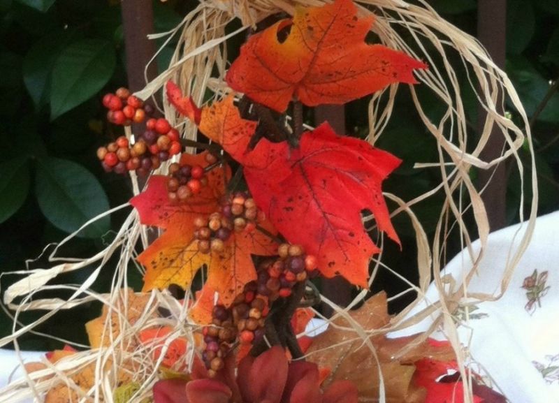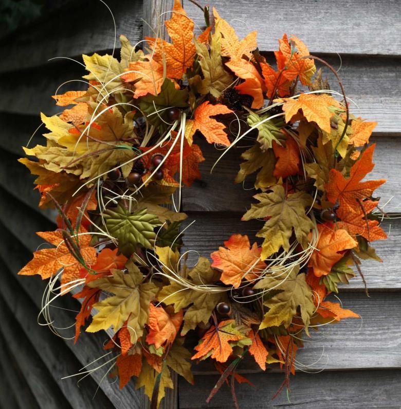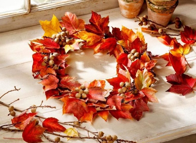 Атмосферен и цветен венец от кленови листа. Венецът украсява входната врата или може да бъде цветна украса за глава.