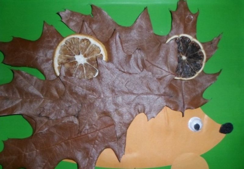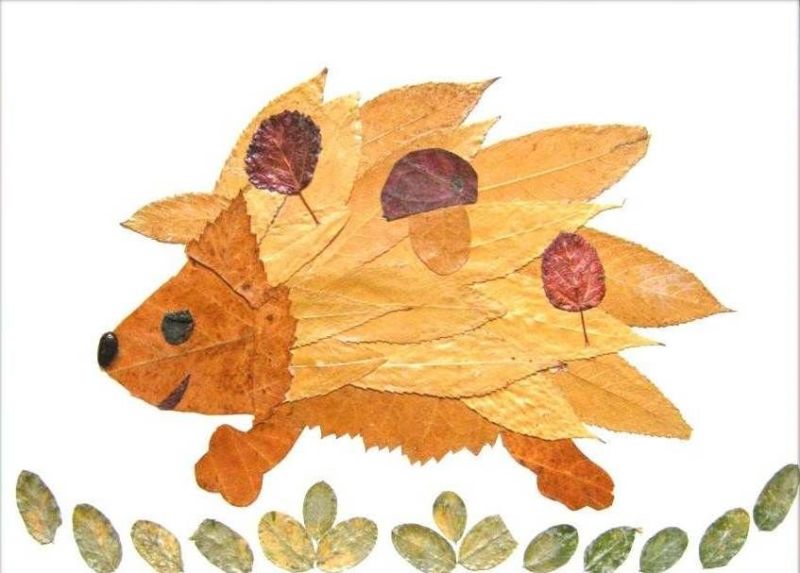 Нарисувайте таралеж върху цветен картон. Оцветете муцуната с боя. Тялото на таралежа е покрито със заострени листа, намазани с лепило. На гърба, сред иглите, залепете гъба и ябълка от цветна хартия.