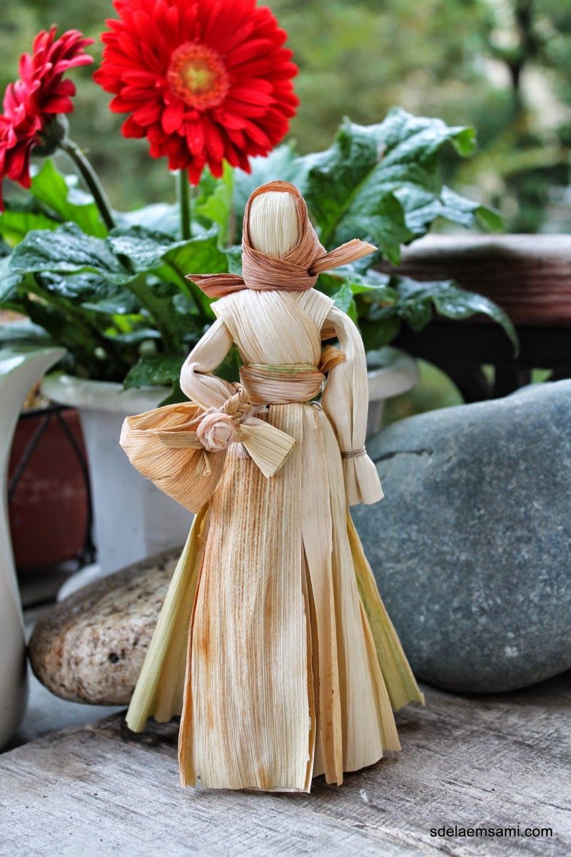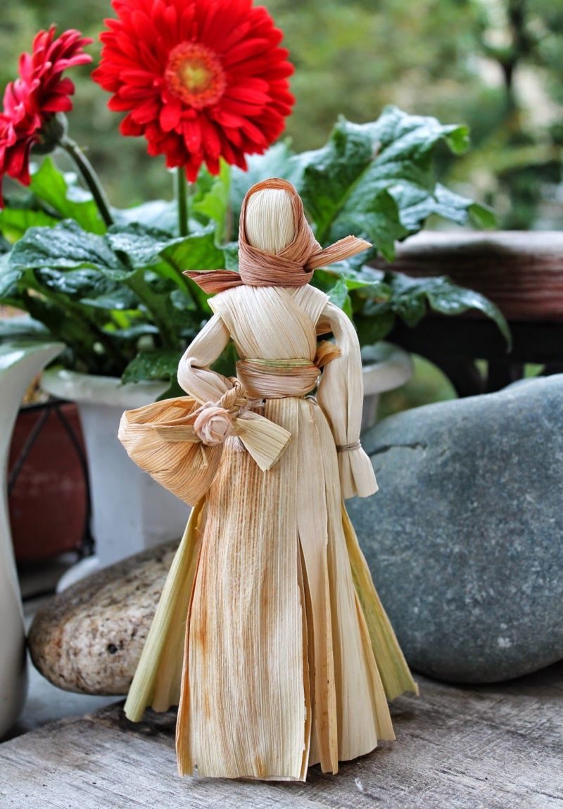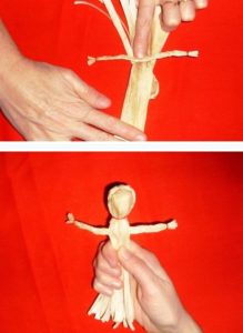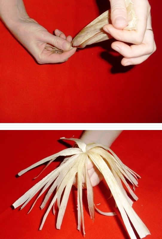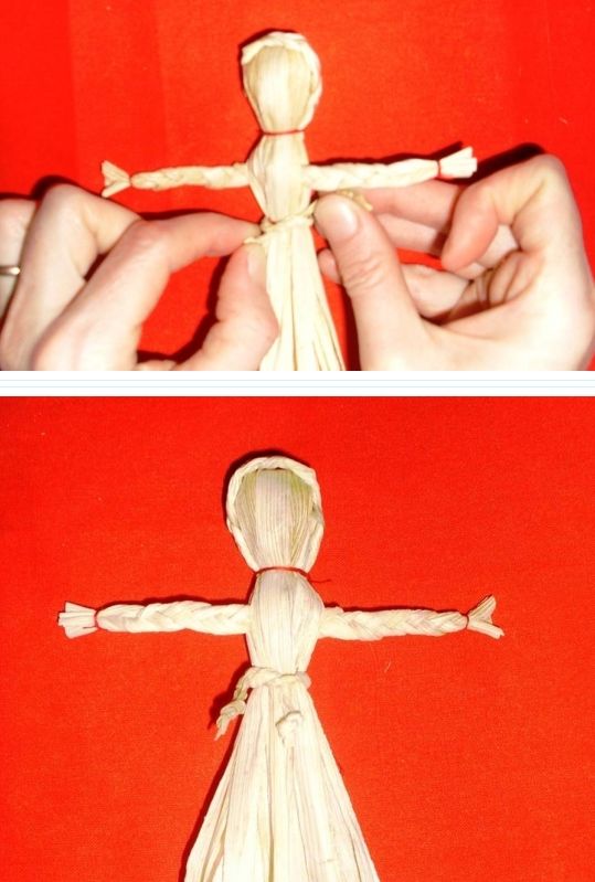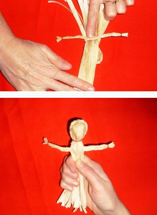 На дясното и лявото рамо "сложете" две царевични листа, а другото завържете плътно на кръста. Получената пола се подрязва, за да може куклата да стои.