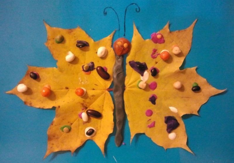 На мястото на горното и долното крило се залепват две двойки подобни листа в различни цветове. Използвайте дългите дръжки на кленовите листа като пипала. Пеперудата е готова!