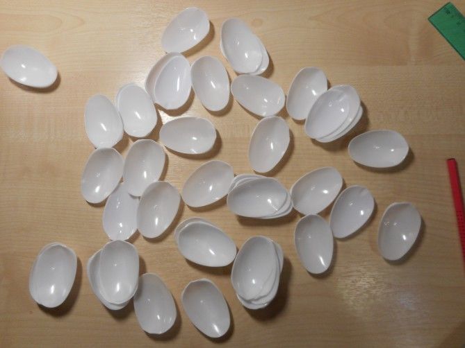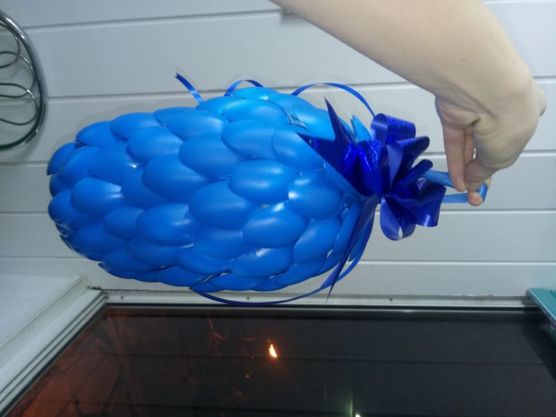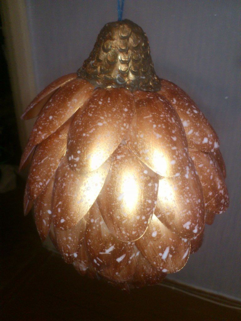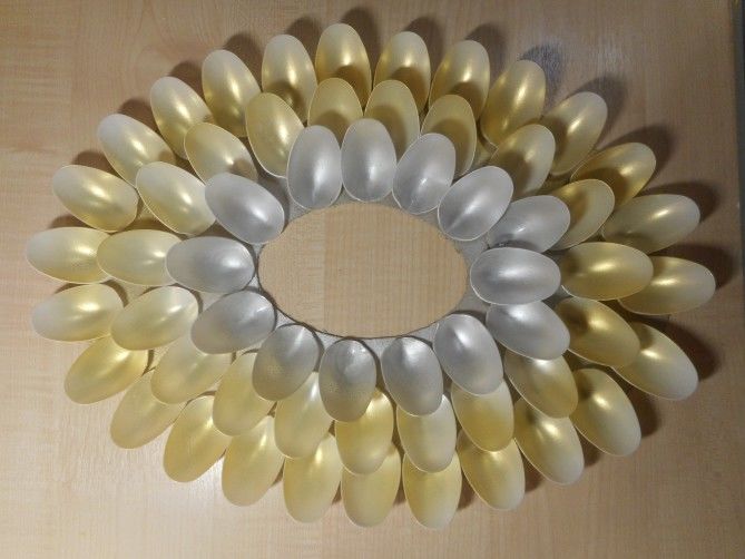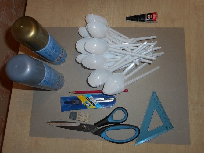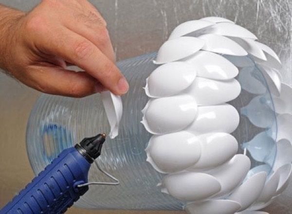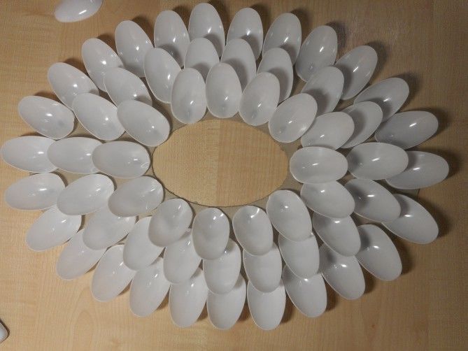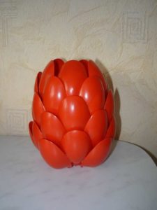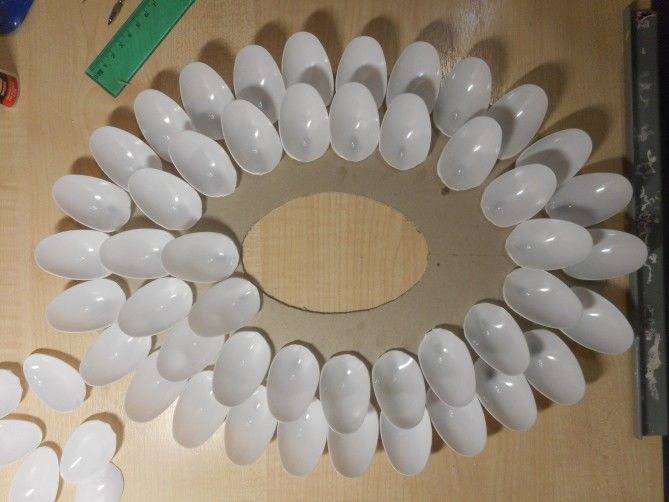 Конусът е направен чрез залепване на лъжиците една за друга. Основата е съставена от 4 лъжици без дръжки, които са подредени във формата на цвете и са залепени една за друга. След това залепете следващите изрязани лъжици, за да образуват "яйце" със заострен връх.
