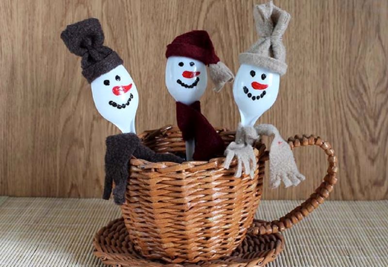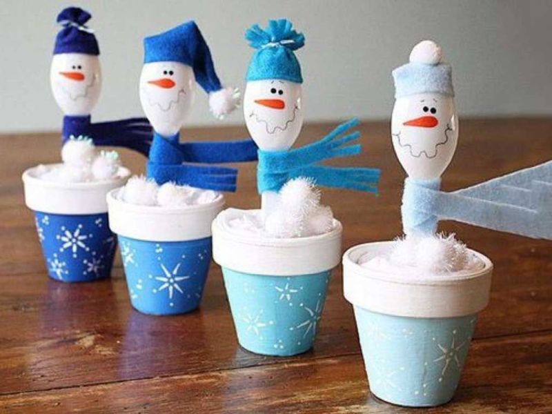 Боядисайте саксията в синьо и залепете върху нея снежинки. Можете да нарисувате лице на снежен човек върху лъжицата и да увиете шал от плат около врата (лента с дължина 5-6 см). Можете да си направите и шапка от филц - под формата на триъгълник или кръг.