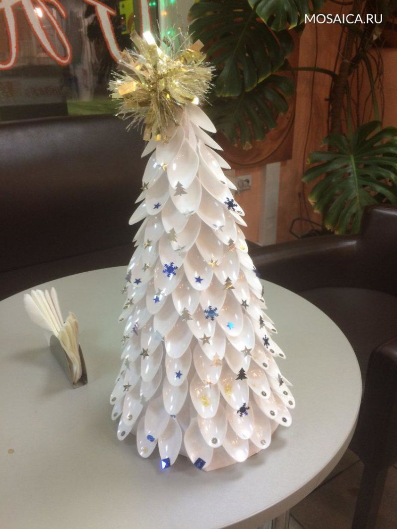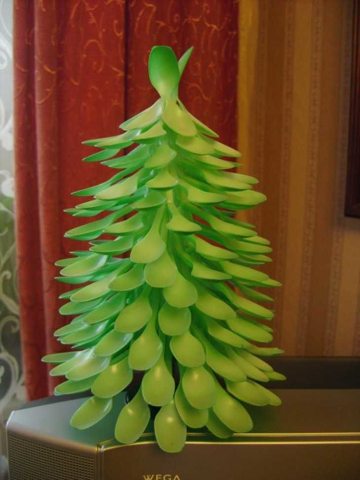 Изработването на коледна елха е много лесно. Използвайте картонен конус, съставен от две части. Върху него са залепени зелени лъжици без дръжки, които се застъпват отдолу.