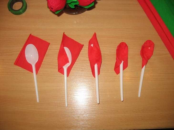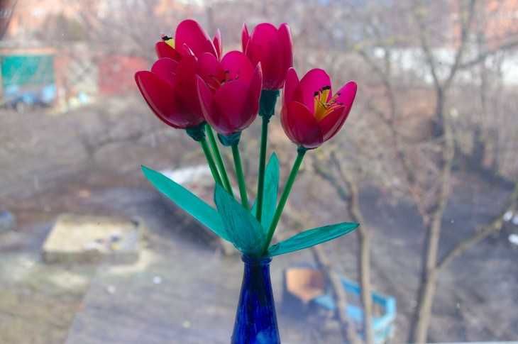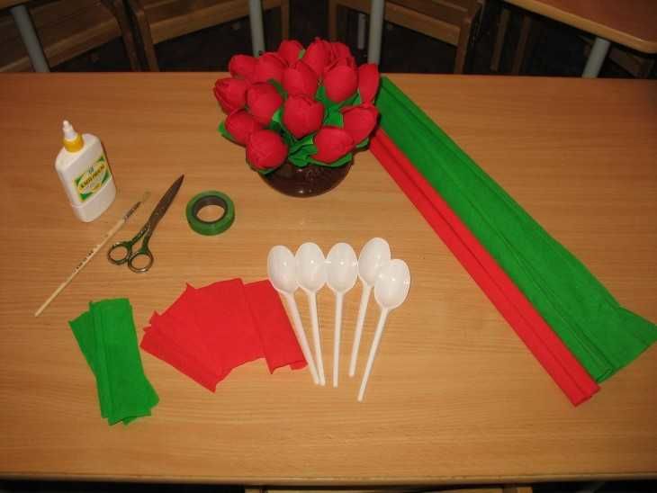 За да направите лалетата, е добре да вземете жълти и червени лъжици - 4 броя - както и сламка за коктейл, шишчета от клонки и пластмасова чиния, и зелена пластмасова бутилка.