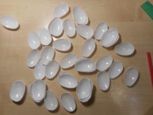 За водните лилии са ви необходими около 11-13 бели лъжици, пластмасови бутилки - прозрачни и зелени, лепило (за предпочитане PVA) и жълта акрилна боя: