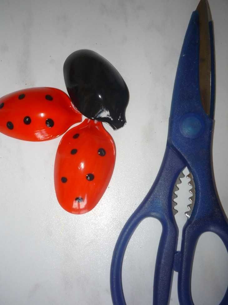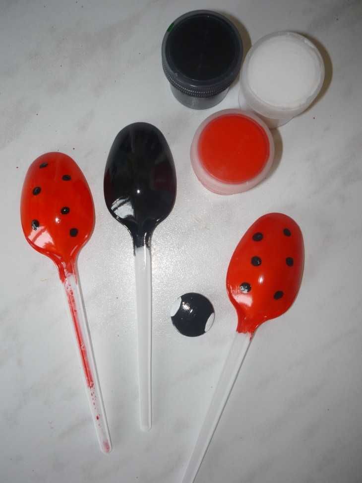 - Боядисайте още две лъжици в червено и направете черни точки.