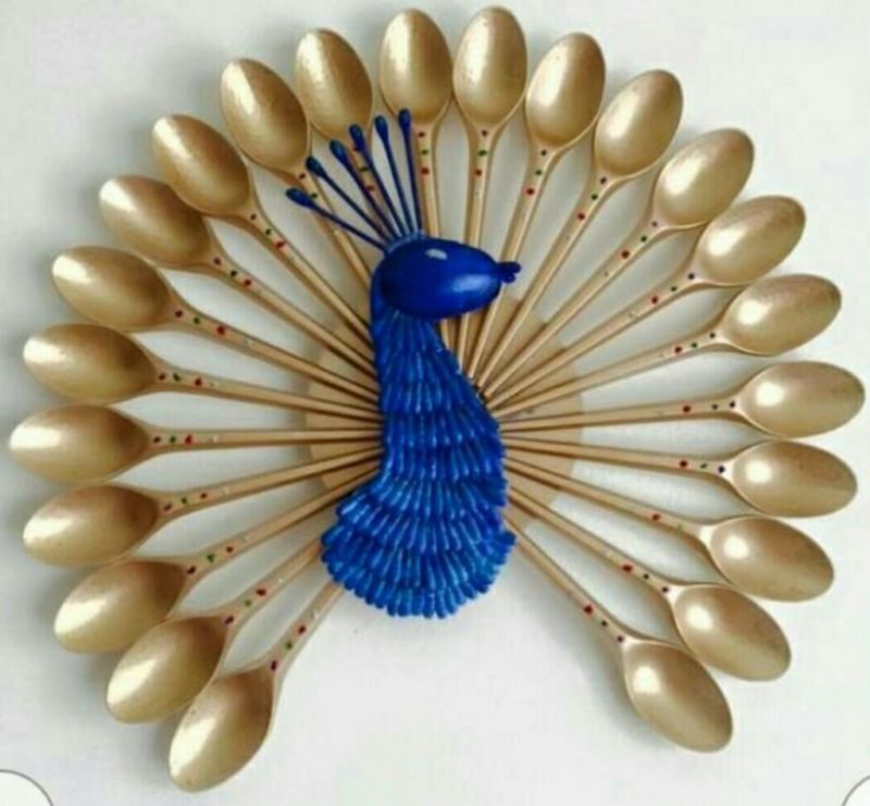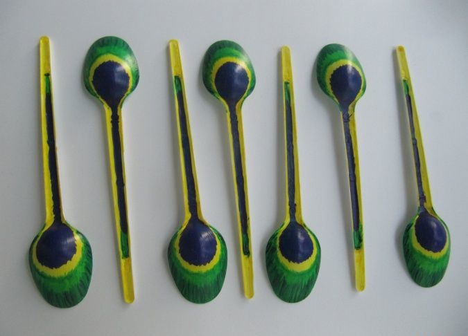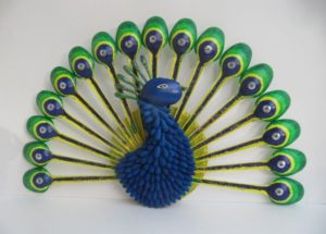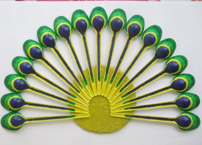 Екзотичен паун с опашка, направена от лъжици, изглежда много интересно. За да направите птицата, вземете около 20 малки лъжички, памучни пръчици, боя (няколко цвята), парче картон, ножица и суперлепило: