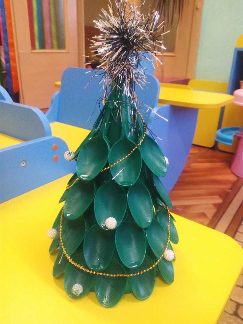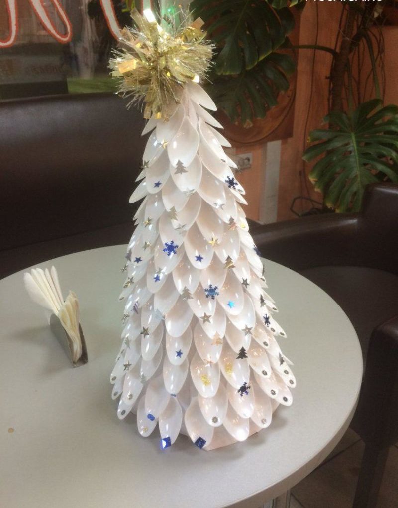 Можете да усложните модела и да направите няколко конуса с намаляване на размера към върха. Получава се стъпаловидна рибена кост, а горните лъжици ще изглеждат като игли. Остава да добавите пайети, конфети, да окачите "дъжд".
