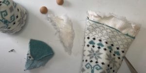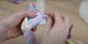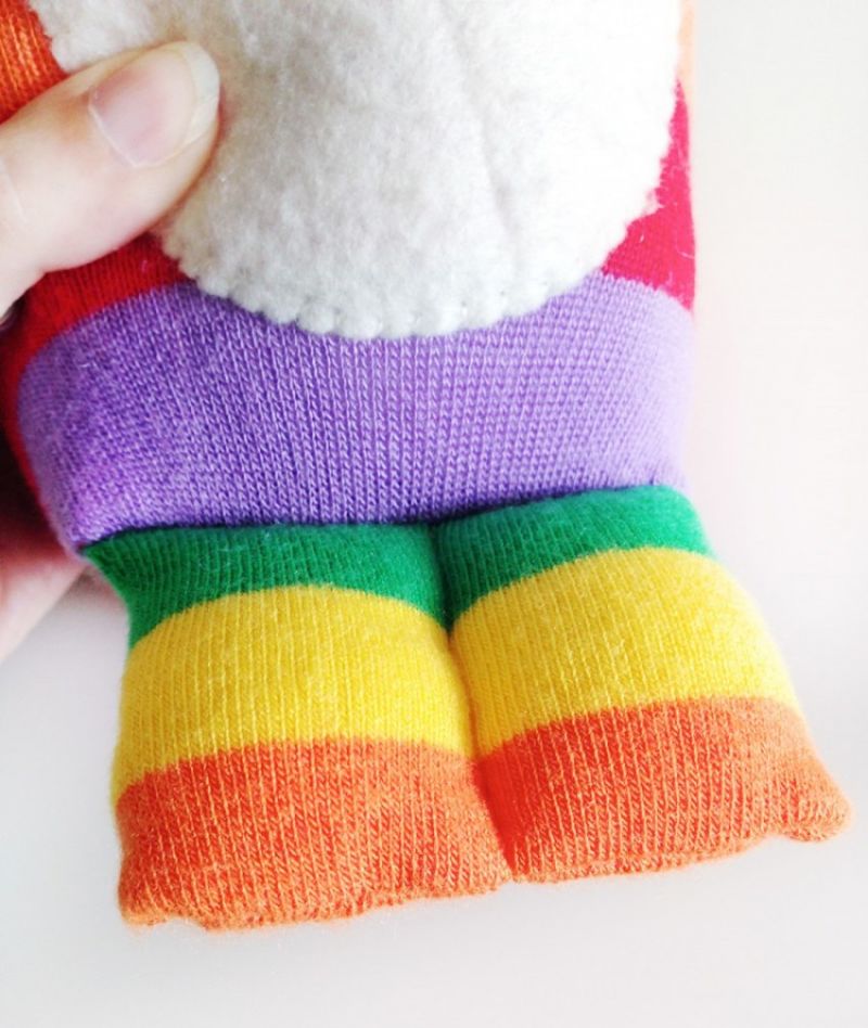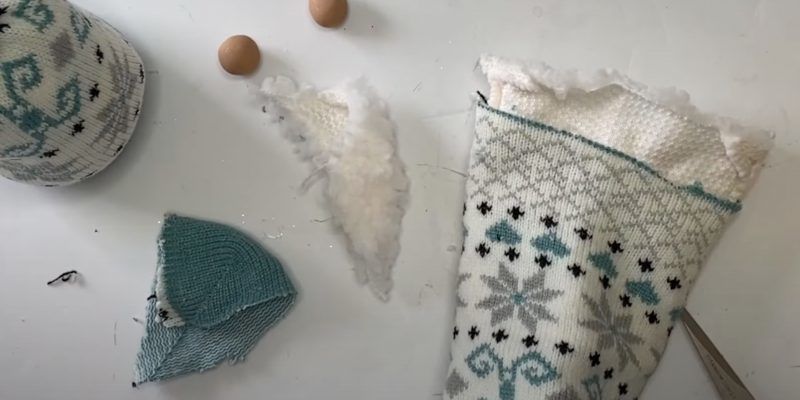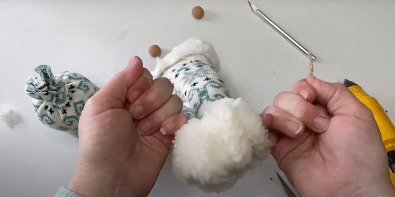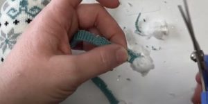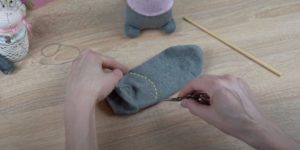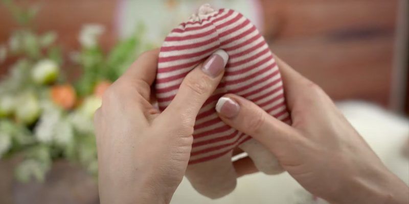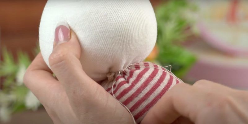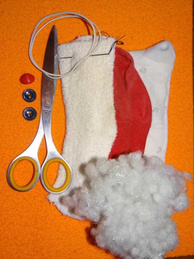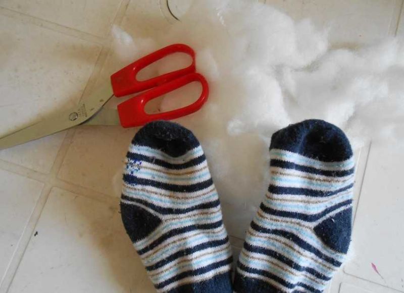 - Горната част на белия чорап е отрязана чак до петата. Едната страна се зашива откъм обратната страна, след което изделието се обръща и се пълни с пълнеж. Дъното е стегнато и зашито.