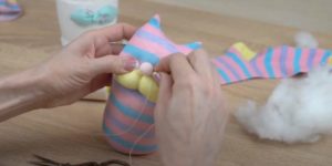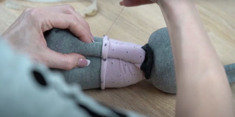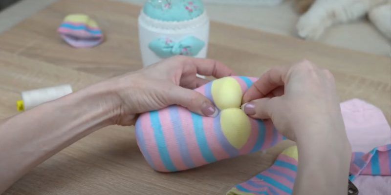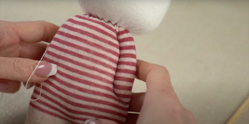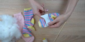 - Белият чорап е натъпкан с пълнеж. С помощта на ластици оформете главата и торса на чорапа. Можете да оформите и долната част.
