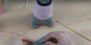 - Петата се отрязва и дупката се зашива. Ако саксията или вазата не е висока, дължината на чорапа може да се намали.