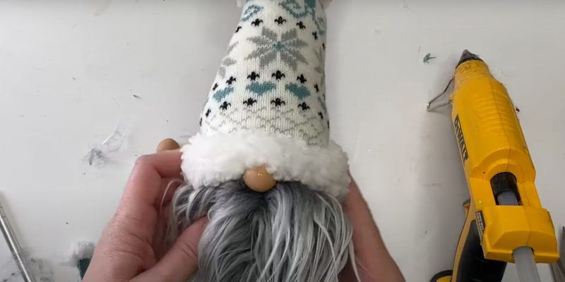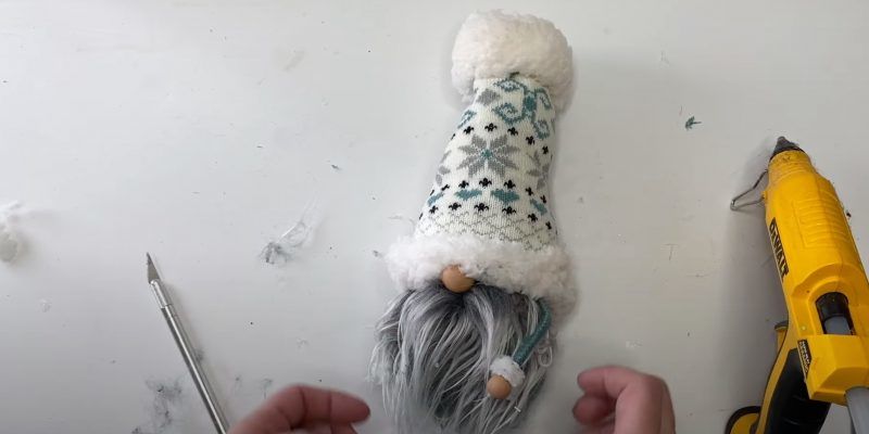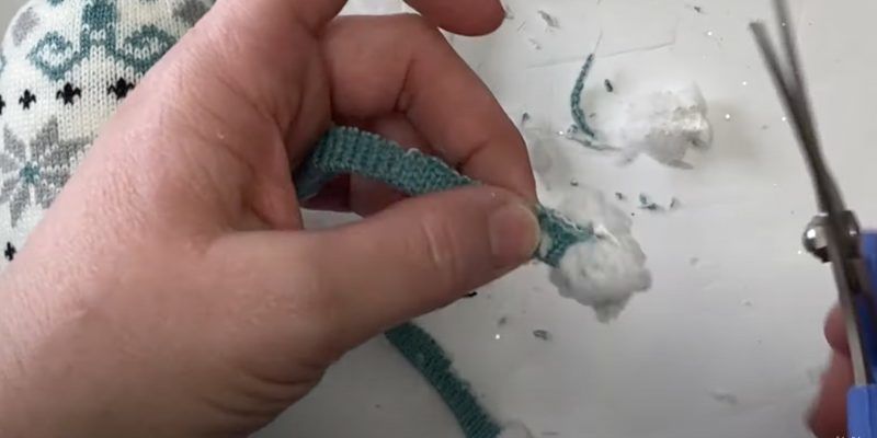 - Подрежете предната част на червения чорап и след това оформете шапка за снежния човек.