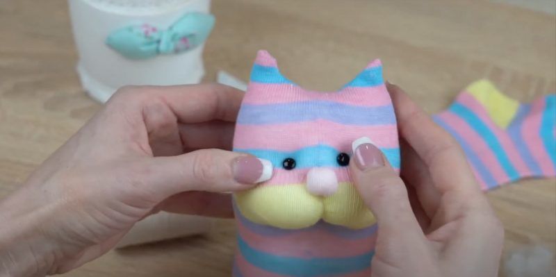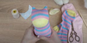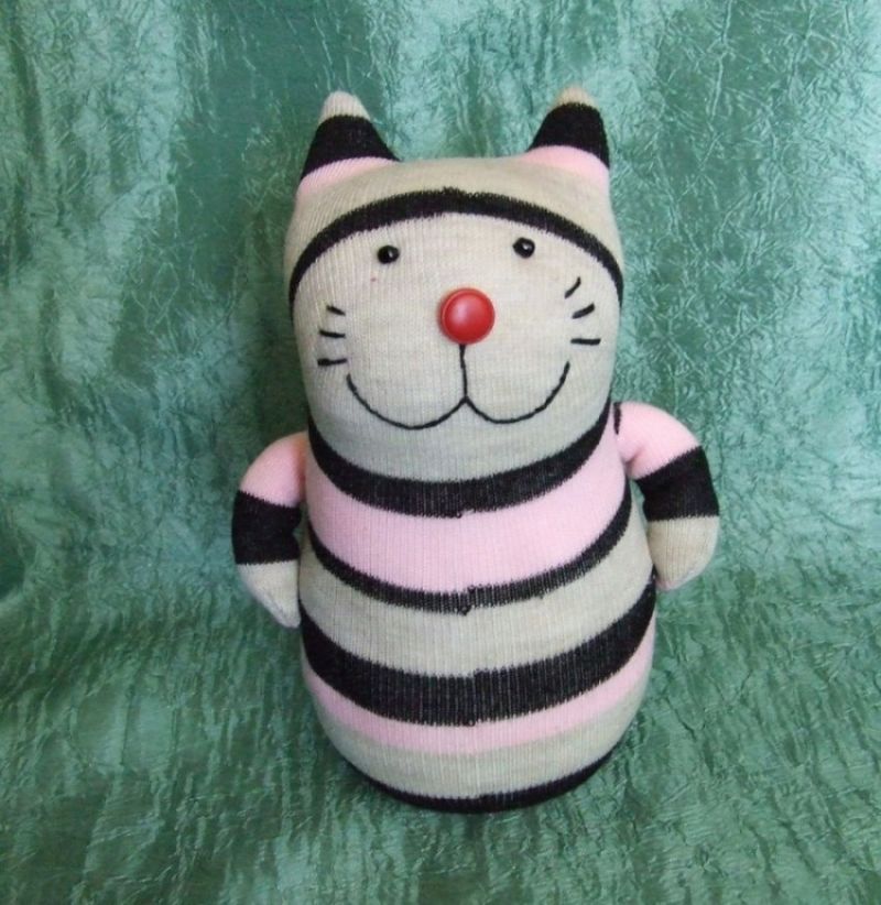 - Тялото е изработено от ярко оцветен чорап. Важното е да съчетаете нюансите. Лентата (или въженцето) ще поддържа главата на котката.