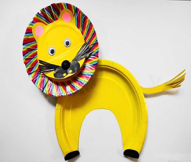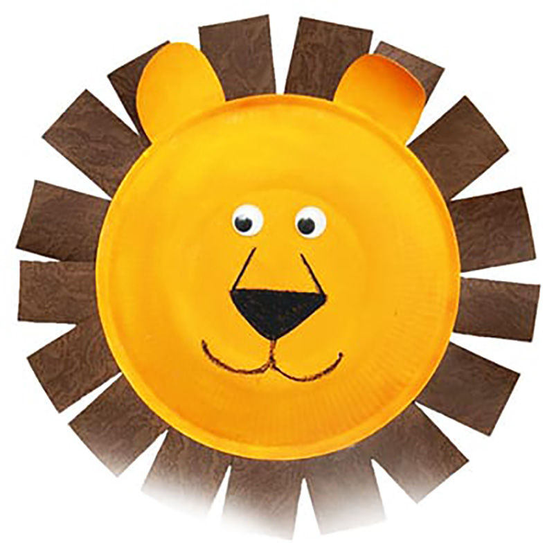 Нарисувайте веселото личице на лъвче върху едната чиния и използвайте светлокафяв цвят по цялата повърхност. Боядисайте другата част в тъмнокафяво. Залепете двата компонента и създайте грива с кръгообразна форма. Отрежете краищата на двете чинии на тесни ленти и накъсайте косата.