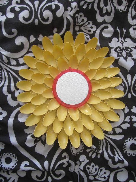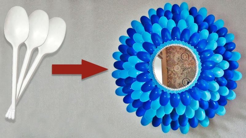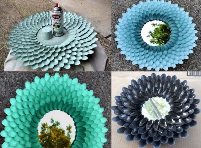 Направете модел на рамката, като използвате прибори за хранене за еднократна употреба и отрежете дръжките им, за да паснат на основата. Лепило и боя. Боядисайте, изсушете и залепете огледалото в центъра, след като изсъхне напълно.
