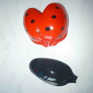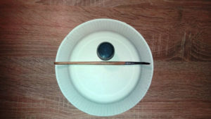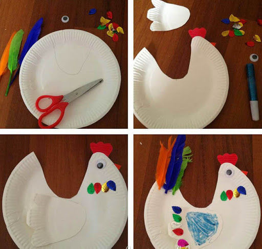 Чинията се разрязва наполовина и се оформя фигура на петел (полукръг до дъното). От едната страна е залепена опашка (сегмент). От другата страна на главата - от червена хартия се изрязват и залепват гребен и брада, а от оранжева - човка. Защото окото вдигна едно малко копче.