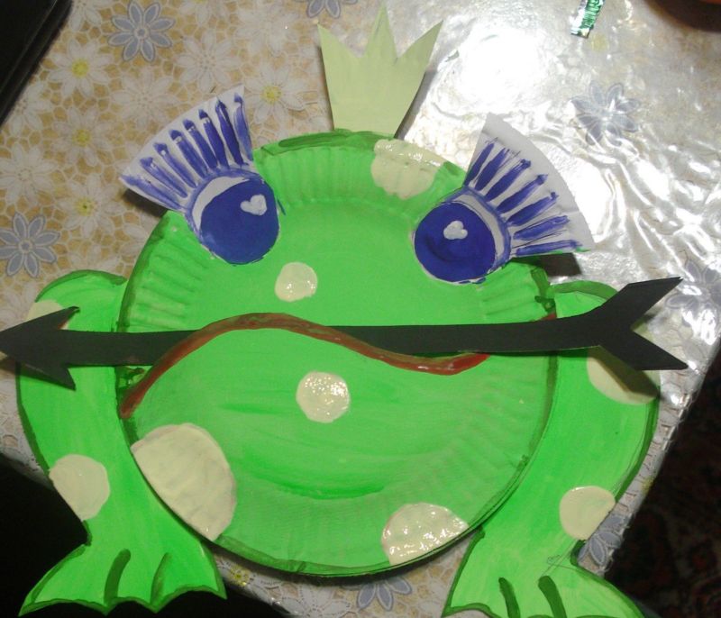 - Боядисайте чинията в зелено от двете страни и я оставете да изсъхне. Това е тялото на жабата.