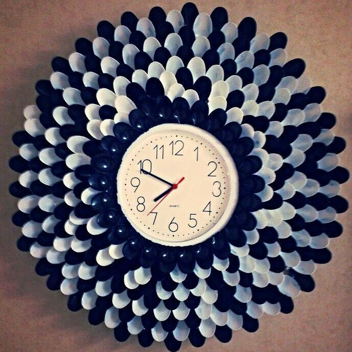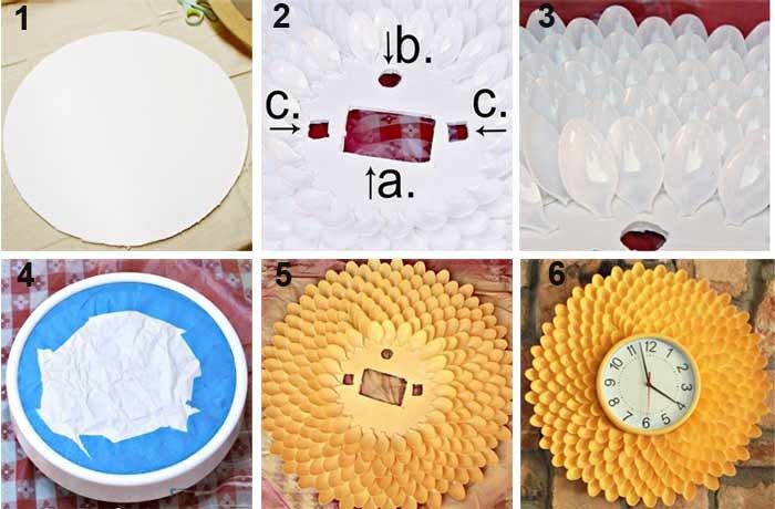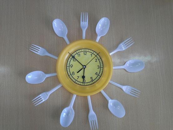 Трикът за направата на този кухненски атрибут е да използвате обикновен кръгъл плосък часовник (за предпочитане с малък размер) и прибори за еднократна употреба, каквито са. Необходими са ви по 10 броя вилици, ножове и лъжици.